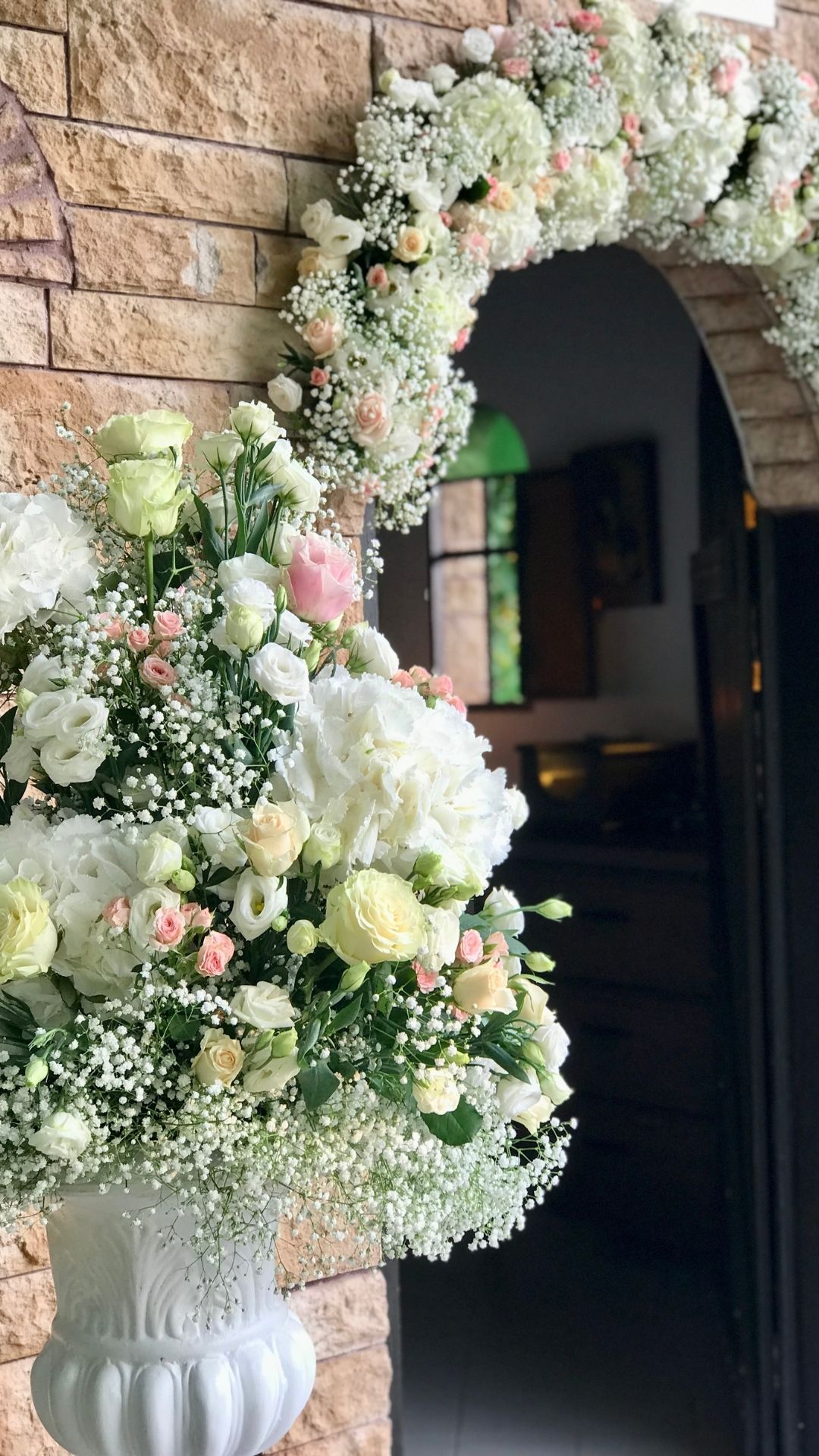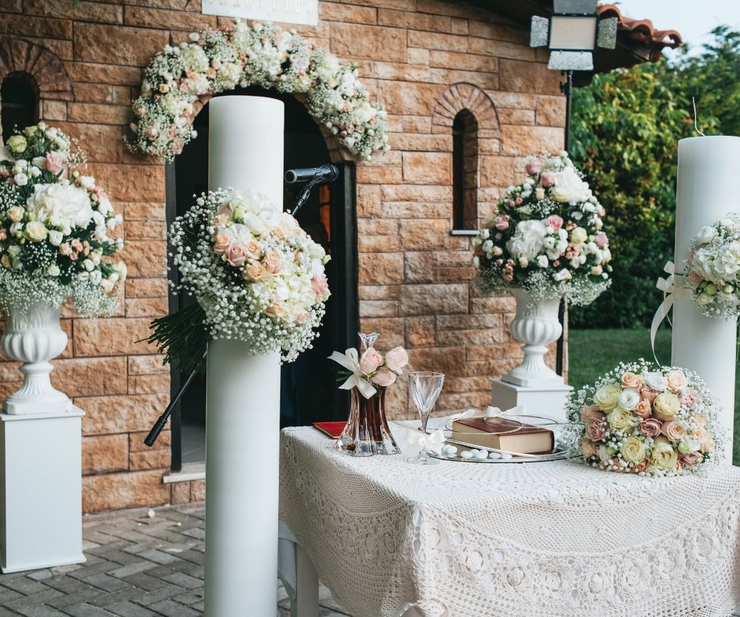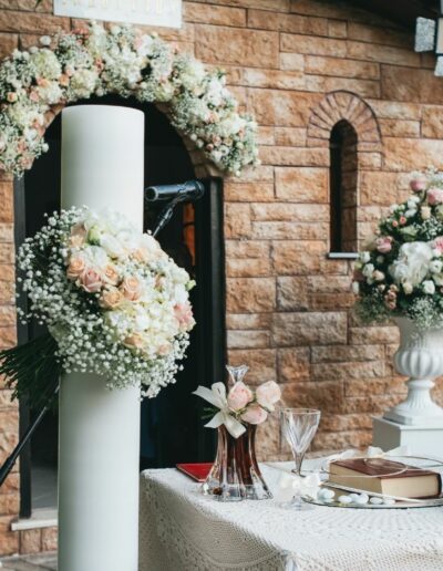 This luxury wedding took place at Filoxenia Estate in Kapandriti, featuring a charming chapel located within the venue. The floral decoration was designed with abundant pastel arrangements in soft shades of pink, salmon and white, adorning the church, wedding favors, crowns, carafes and ceremonial trays with elegance and harmony. A special highlight of the day was the groom’s Cretan heritage, celebrated with live traditional music and lyra players escorting the bride and groom to the chapel. The joyful spirit and humor shared by the couple and their friends were beautifully captured throughout the day, creating a wedding atmosphere filled with warmth, authenticity and unforgettable moments. Designed with care by SBL Events