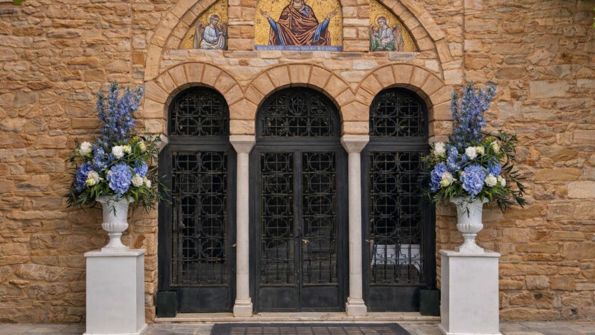 Βάπτιση στην Ιερά Μονή Πεντέλης με Ανθοστολισμό σε Σιέλ και Λευκές Αποχρώσεις