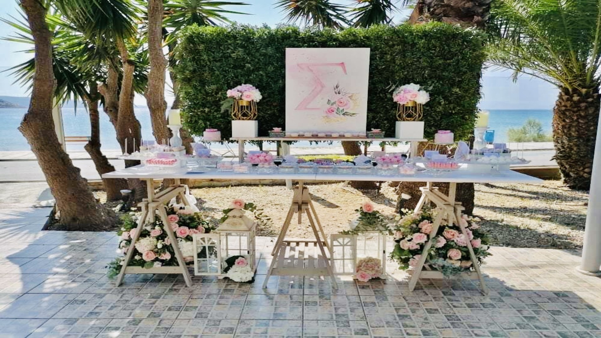 Με αφετηρία το μονόγραμμα της μικρής «Σ», σχεδιάσαμε ένα απόλυτα εναρμονισμένο concept που ξεκίνησε από το προσκλητήριο και εξελίχθηκε σε μια ολάνθιστη διακόσμηση σε ροζ και λευκές αποχρώσεις. Τριαντάφυλλα, ορτανσίες και πλούσιες ανθοσυνθέσεις δημιούργησαν μια αίσθηση φρεσκάδας και κομψότητας. Η δεξίωση στο Le Mirage Life Events, επίσης δίπλα στη θάλασσα, μεταμορφώθηκε σε έναν ρομαντικό, ανθισμένο παράδεισο με εντυπωσιακά centerpieces, μεγάλης κλίμακας candy bar με cupcakes, cake pops, μικρές τουρτίτσες, ταρτάκια, κουφέτα και μπεζέδες, καθώς και μια επιβλητική πλάτη με φυλλώματα και χειροποίητη ζωγραφισμένη κατασκευή που απέδιδε το θέμα του προσκλητηρίου. Το welcome sign, οι μπομπονιέρες στα τραπέζια, οι διακοσμητικές γωνιές με βιβλίο ευχών, τα φανάρια και τα κεριά, καθώς και ο στολισμός της πισίνας, συνέθεσαν μια ολοκληρωμένη, υψηλής αισθητικής εμπειρία